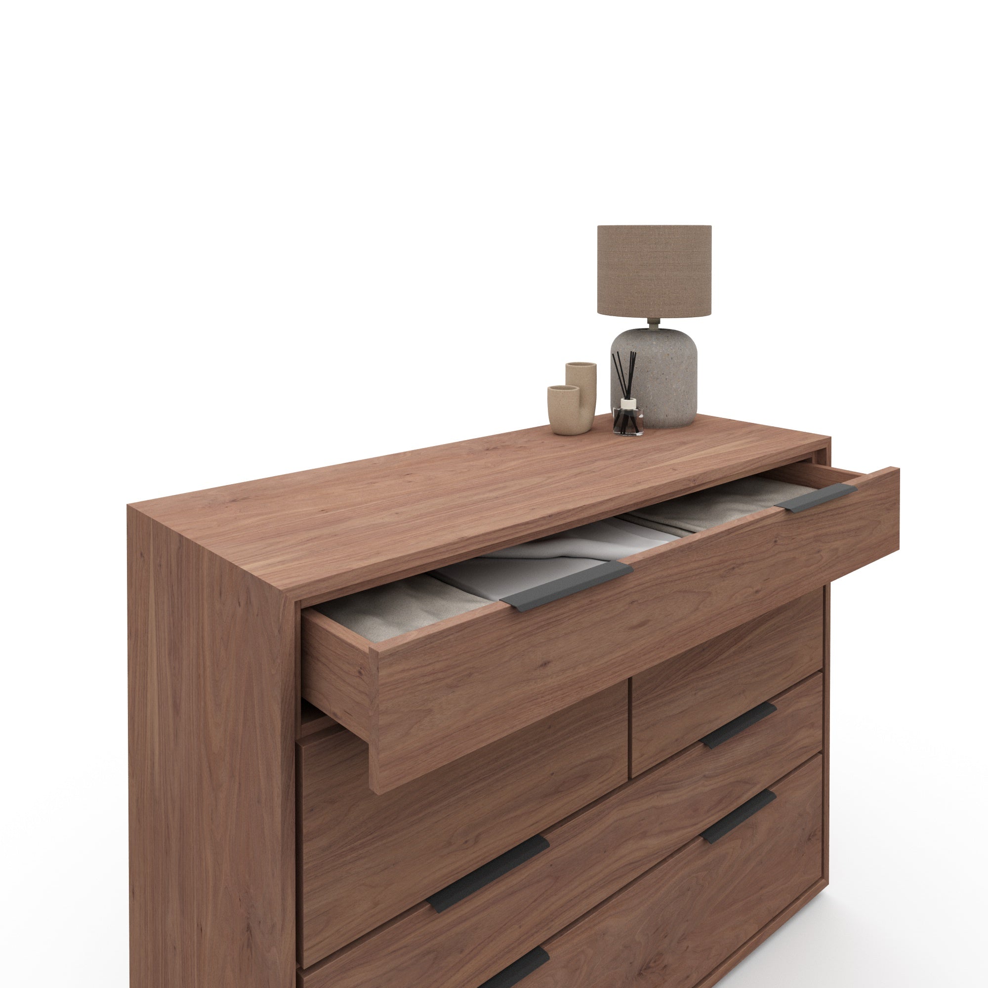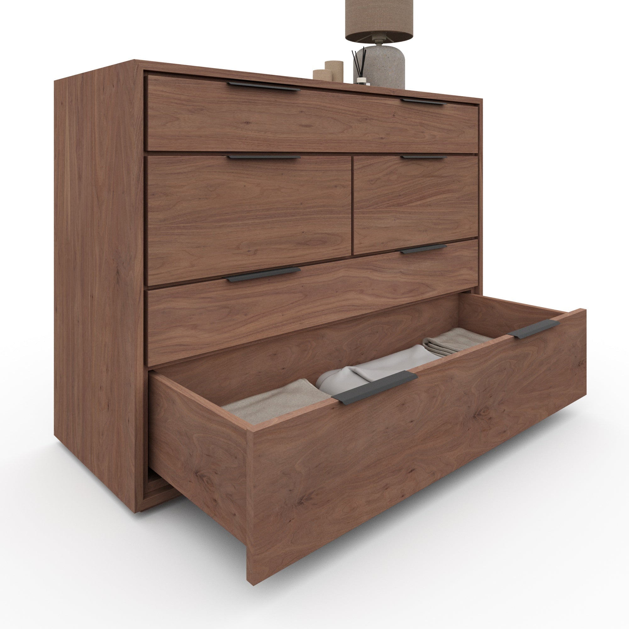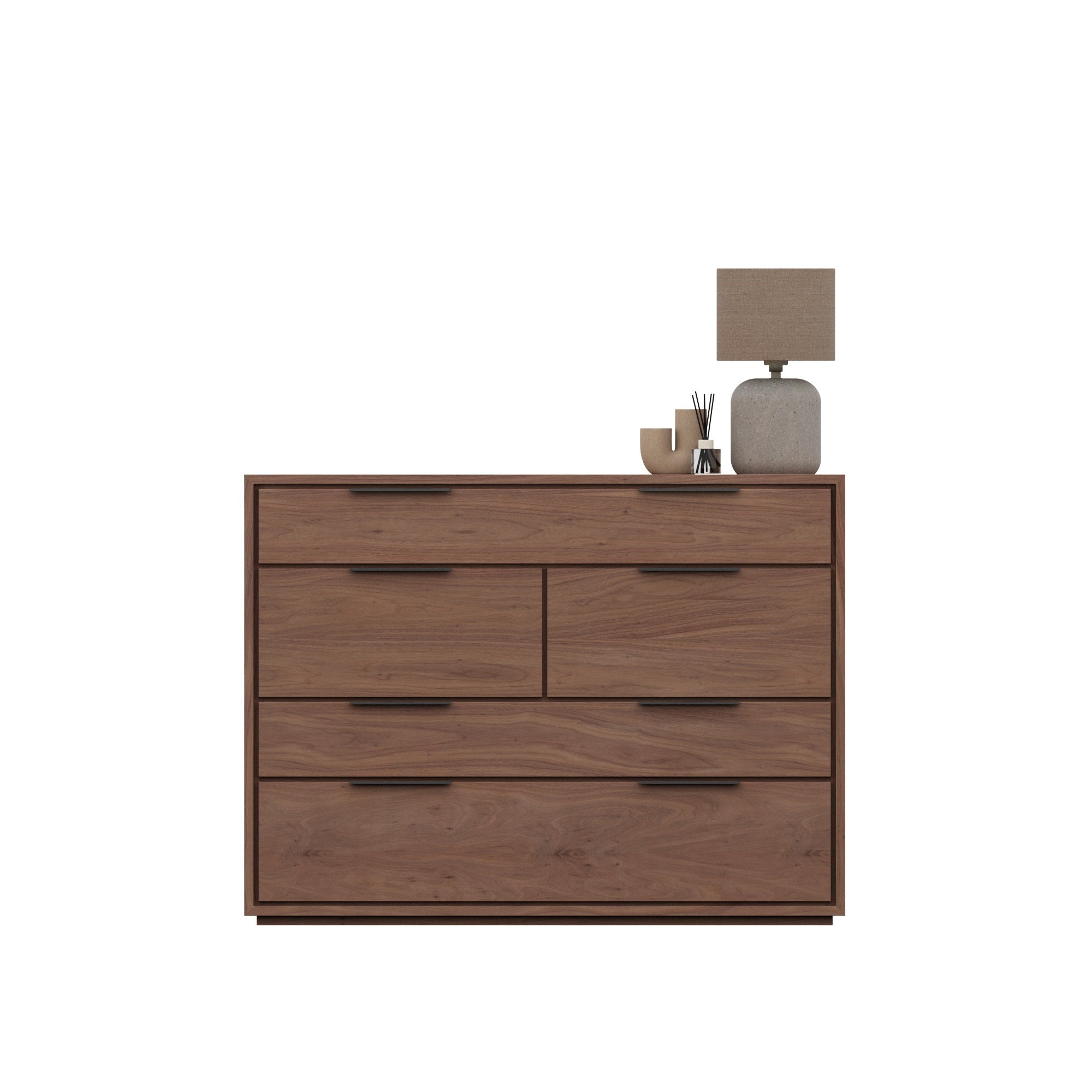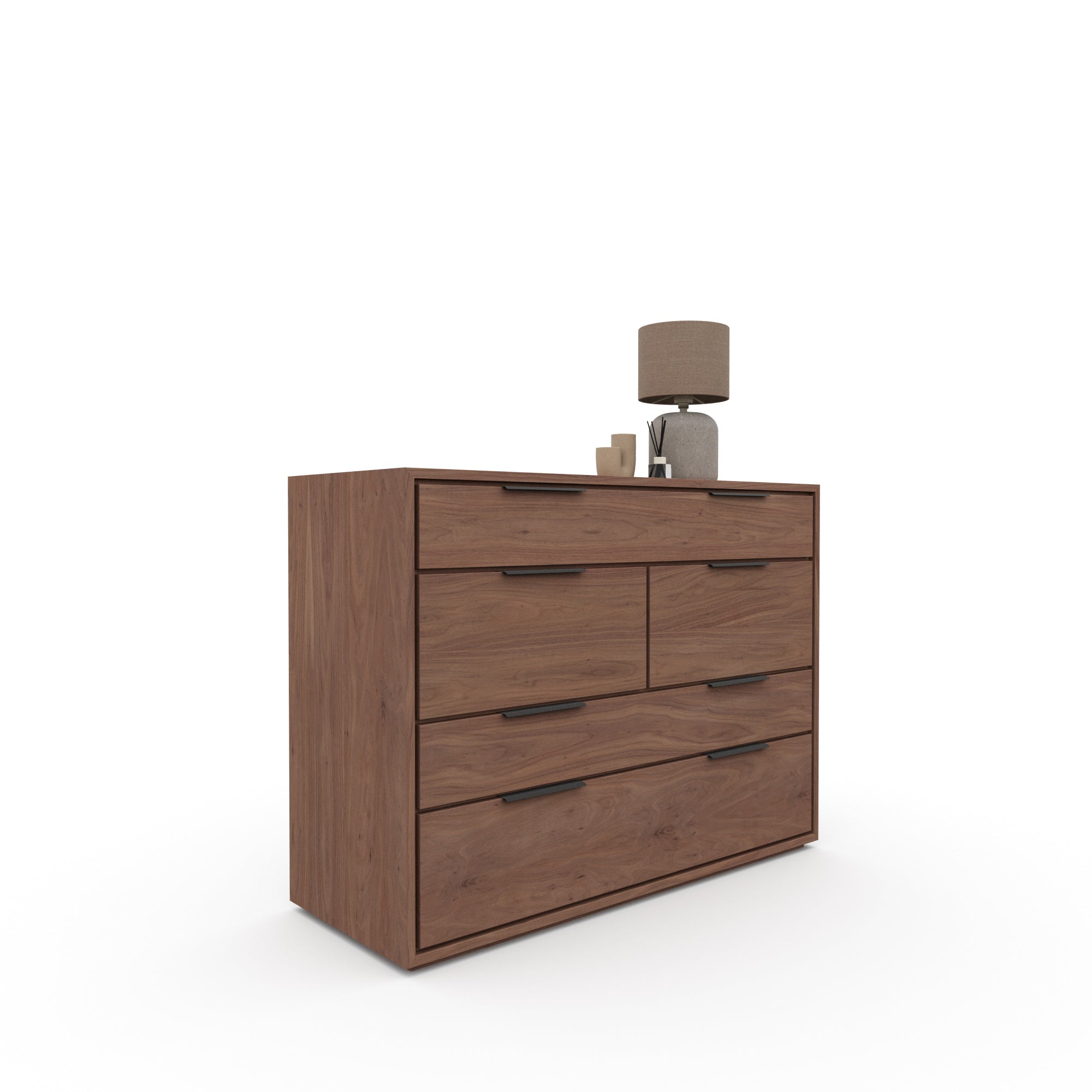 Crafted with high-quality walnut veneer, the Aspen chest of drawers is a durable and elegant addition to any room. Its sleek design and ample storage space make it a functional and stylish piece of furniture. Experience the benefits of a well-crafted chest of drawers with Aspen.